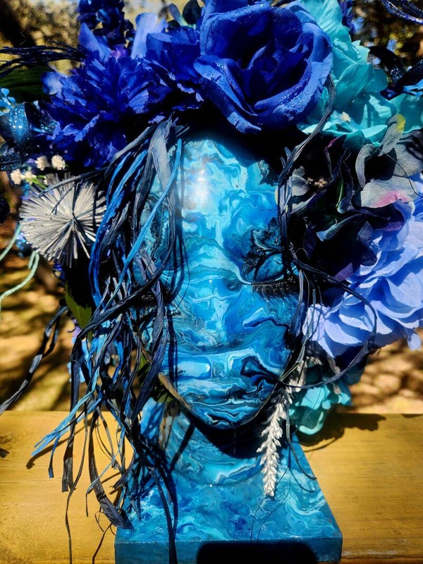 This breathtaking skull sculpture is an explosion of deep, midnight blue — bold, haunting, and undeniably beautiful. The skull form is richly painted in swirling shades of cobalt and teal, with a marbled, almost oceanic quality to the base that grounds the entire piece.
