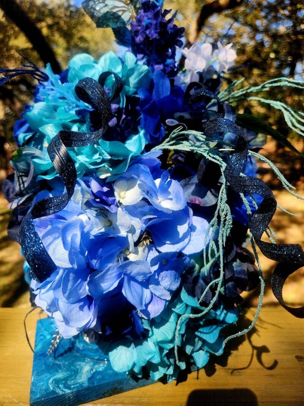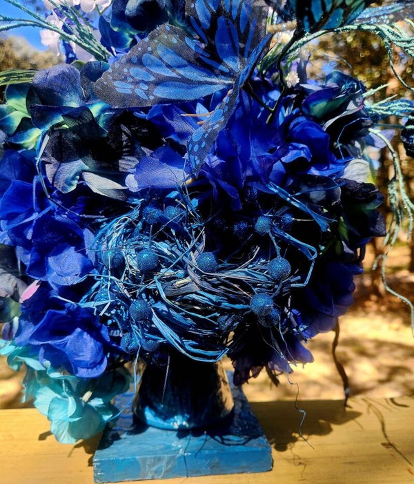Peacock-hued accents and deep jewel-toned petals peek through the arrangement, adding richness and depth. The whole piece sits on a hand-painted blue resin block pedestal, photographed beautifully against a sun-dappled, outdoor backdrop.